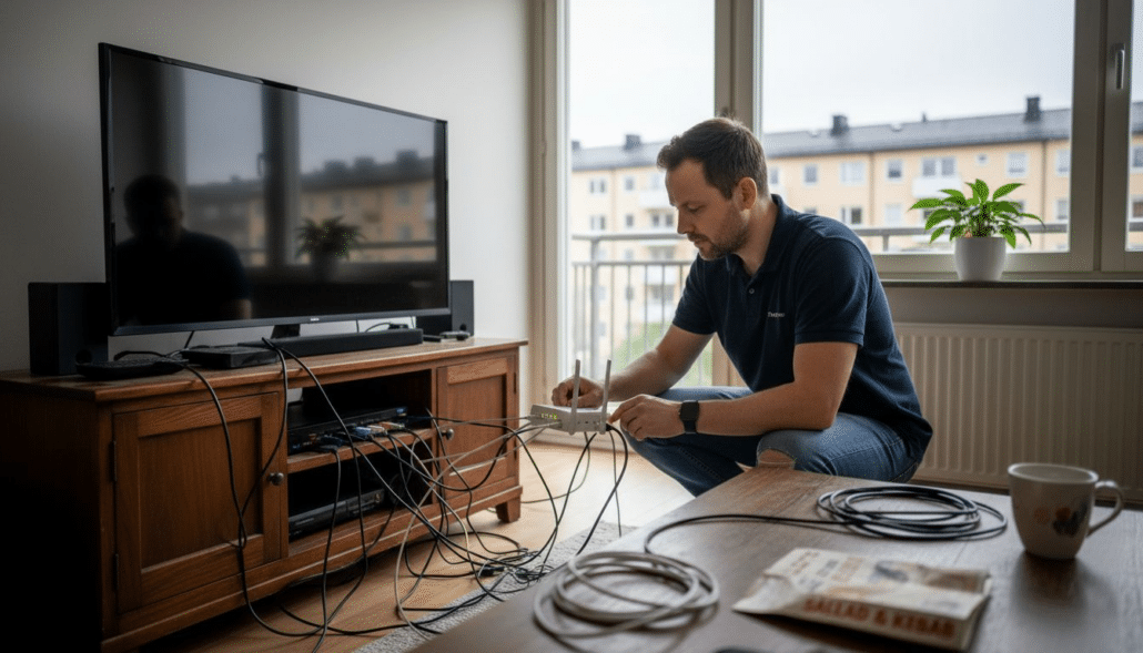 Felaktig placering skapar signalproblem som många missförstår som dåligt bredband. En router gömd bakom TV:n eller i ett hörn når inte hela bostaden effektivt. Tjocka väggar, metallföremål och stora akvarier blockerar Wi-Fi-signaler drastiskt.